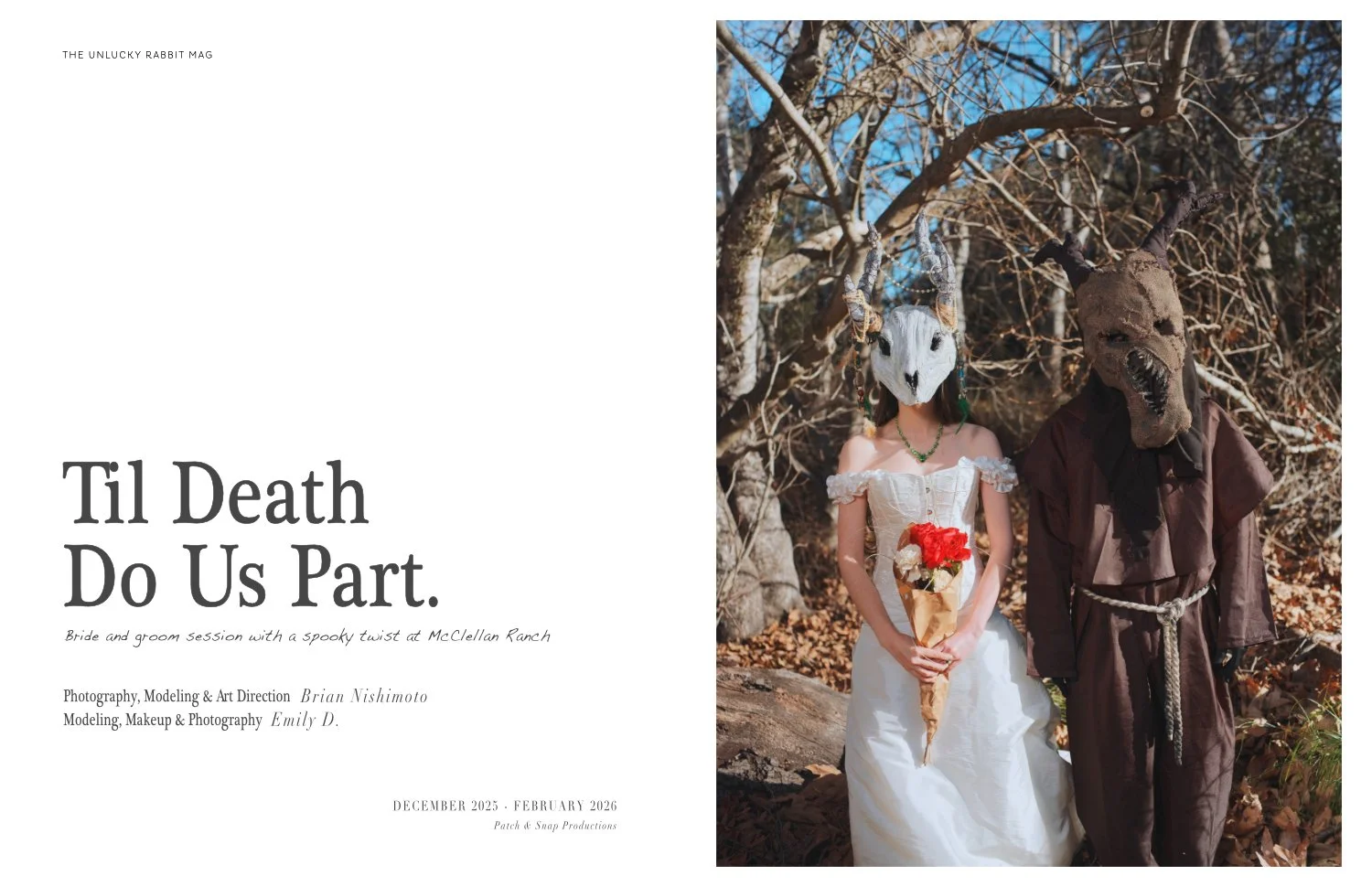 Unlucky Rabbit Mag special edition featuring a bride and groom session with a spooky twist at McClellan Ranch. Taken with a Fujifilm XH2 + Sigma 17-40mm f1.8 + 10-18mm f2.8 lenses and Fujifilm GFX 50s + adapted Tamron 45mm f1.8 & 85mm f1.8 lenses in Classic Chrome.